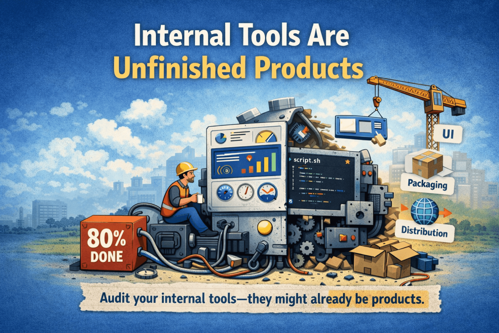 Many teams build scripts and internal tools that solve real problems, then stop there. But those tools are often 80% of a product—missing only packaging, UI, and distribution.